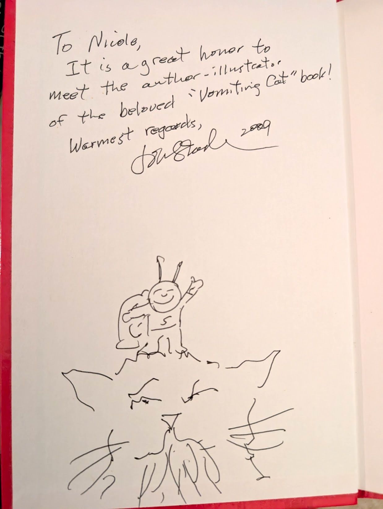 I've now had the privilege of introducing my son to the works of John Stadler, and of watching him laugh his head off at the antics of Snail and John's other creations. It breaks my heart that we won't have the opportunity to cross paths one more time, but I'm grateful for John's many books that will keep his humor and his wonderful imagination alive for another generation—mercifully with a dearth of vomiting cats.
