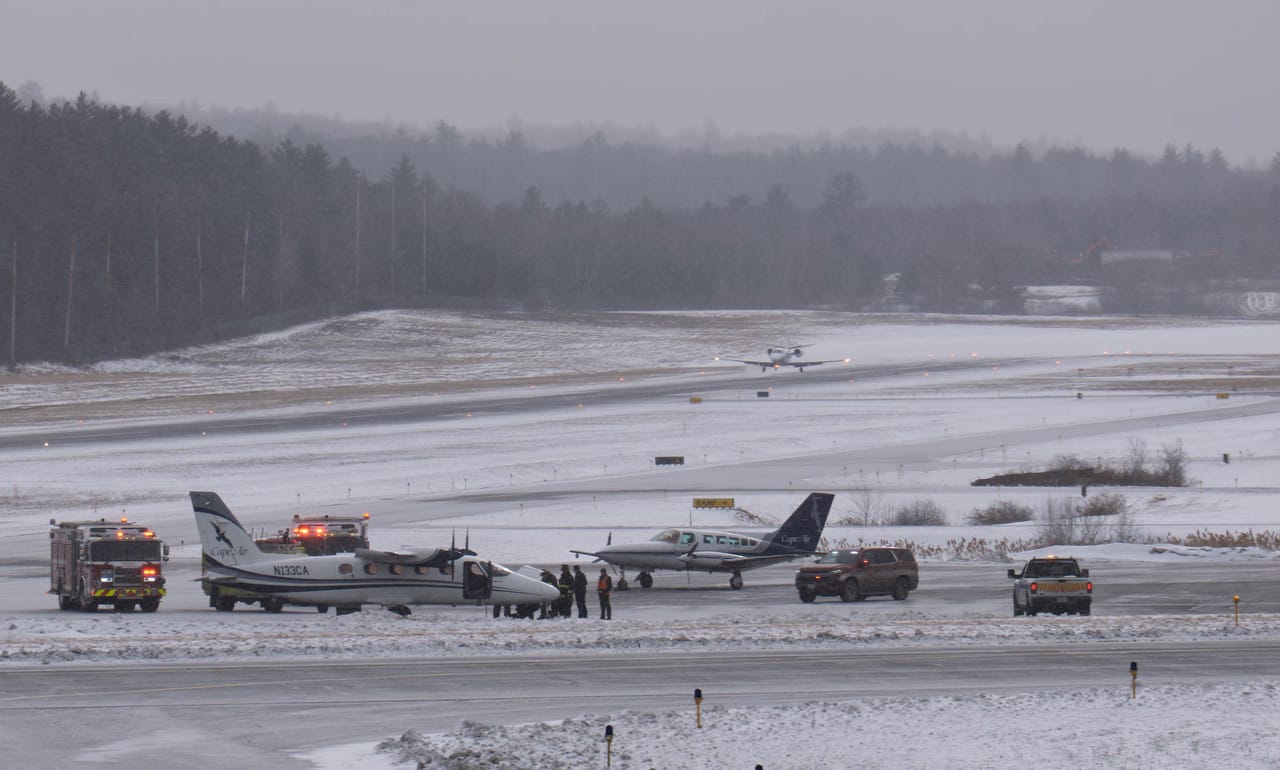 A Cessna commuter plane belonging to Cape Air is surrounded by fire trucks after it was forced to return to the Lebanon Airport and make an emergency landing late Friday morning due to smoke in the cabin. Photo © Eric Francis